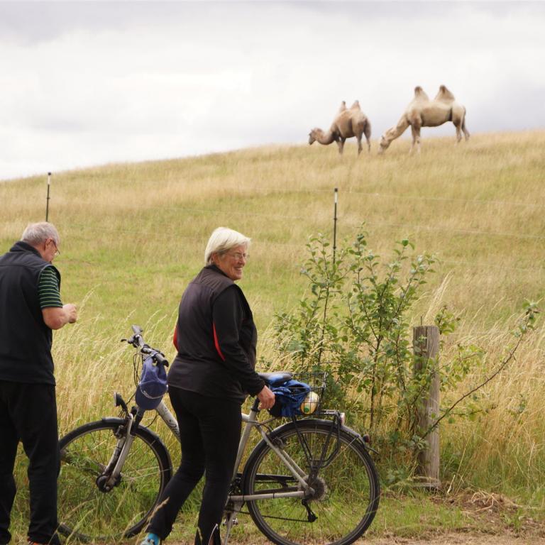 Von Sternberg aus fahren wir auf dem Radweg T 30 in Richtung Groß Raden. Nach ca. 3 Kilometern - Kamele in Mecklenburg? Der Kamelhof