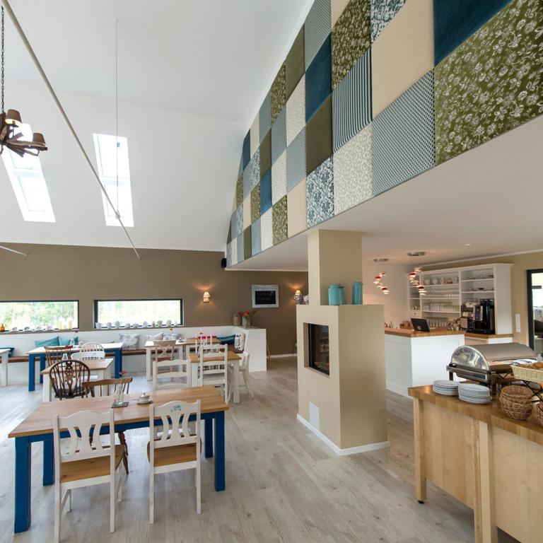 Auch herzhafte Snacks finden Sie auf der Karte. Auf der großen Sonnenterrasse mit Blick auf die Warnow können Sie auch Eis genießen. Auf der Wiese gibt es Spielmöglichkeiten, wie Tischtennis oder Leitergolf, direkt daneben steht unser Kinderspielhaus "GUTskinder". Drinnen sorgt ein Kamin für kuschelige Atmosphäre. Morgens serviert hier das Team von GUT VORBECK den Gästen das leckere Landhausfrühstück. Das Gutscafé "HerzensGUT" können Sie auch für Feierlichkeiten mieten. Bis zu 35 Gästen bietet das Haus Platz.
