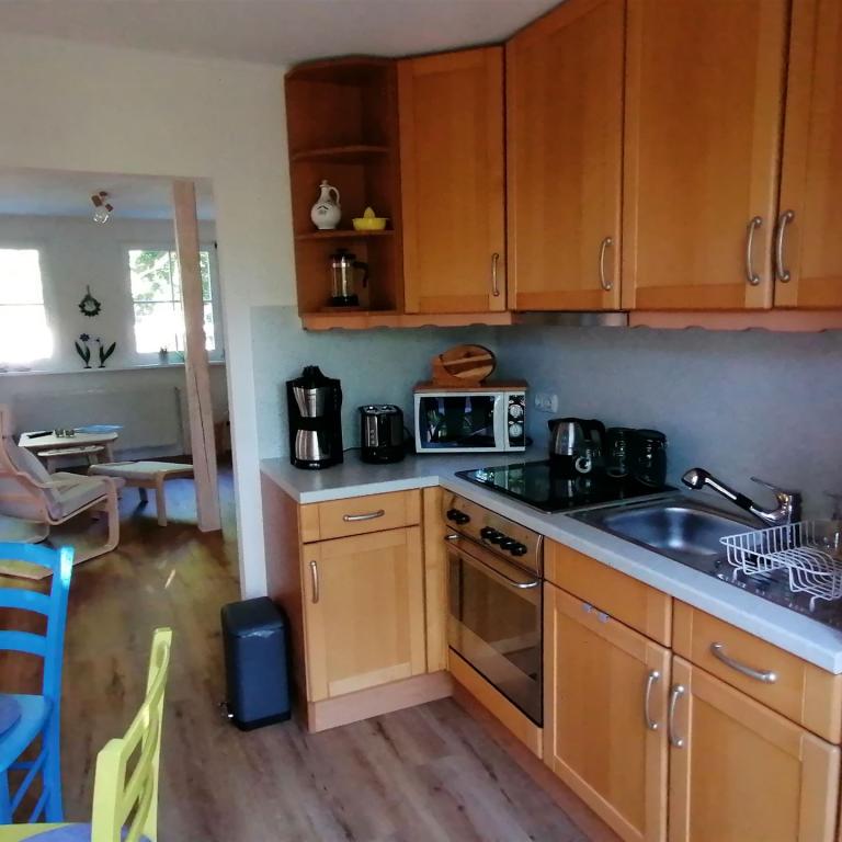 Die Küche ist mit Herd/Backofen, Kühlgefrierkombination, Mikrowelle, Kaffeemaschine ausgestattet. Von hier aus können sie den Balkon mit Blick in den Garten betreten. Ein großzügiger Wohnraum lädt auch an Regentagen zum Verweilen ein.