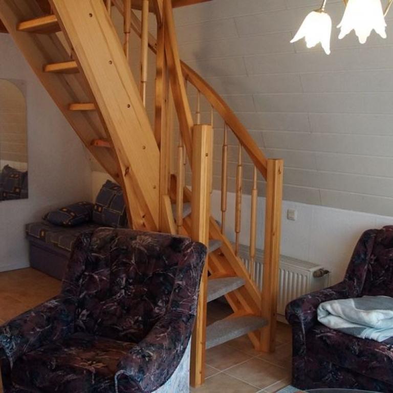 lm Erdgeschoss der Finnhütte finden Sie einen gemütlichen Wohn- Essbereich mit Flachbild-Sat-TV, eine kleine Küche und ein Duschbad. Ein Sofa wird bei Bedarf zum Doppelbett. lm Obergeschoss ist der Schlafraum für drei Personen. Von der möblierten Terrasse aus schauen Sie auf unseren kleinen Weiher und in den Obstgarten. Ihren Hund können Sie gern mitbringen.