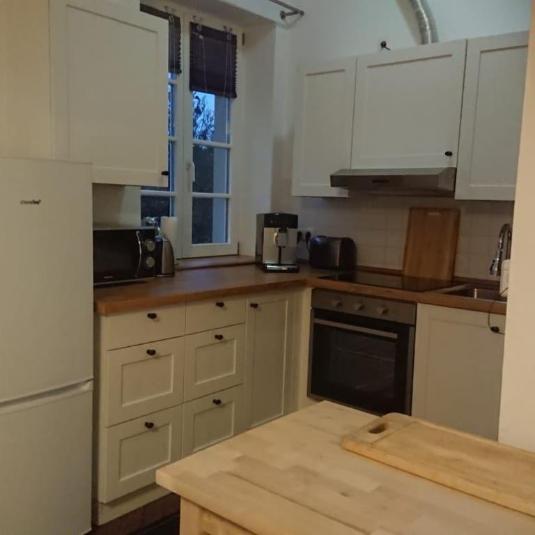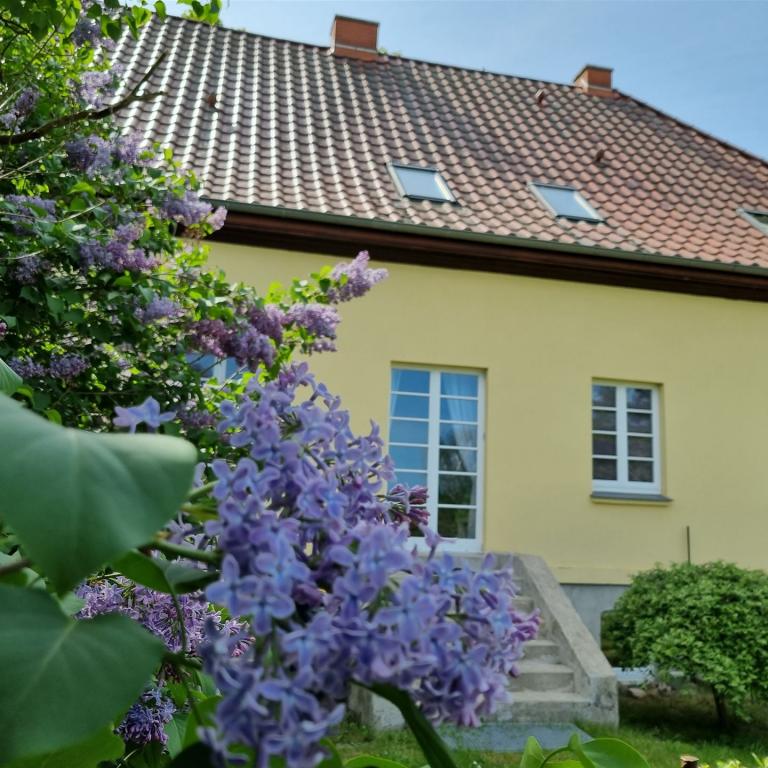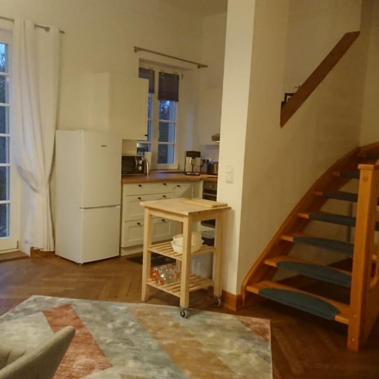 Im Gutshaus befindet sich eine 140m² große Ferienwohnung auf drei Etagen. Die Wohnung verfügt über eine offene Wohnraumgestaltung, hohe Decken und Echtholzböden.