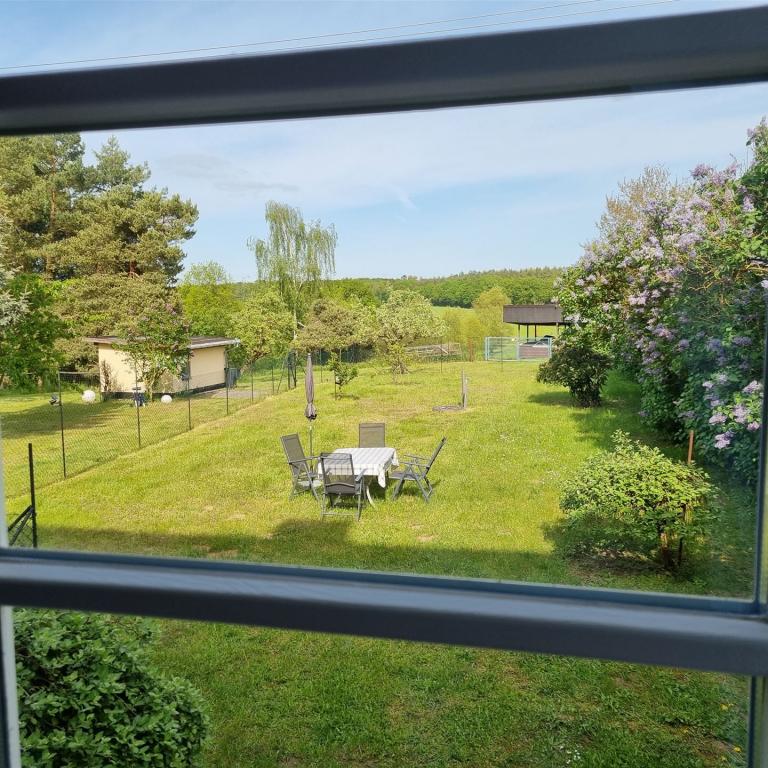 anschließend gelangt man in den offenen und hellen Wohnbereich mit Schlafsofa (1,40 x 2,00m) inkl. Sat.-TV und Blick durch den Garten in die Natur;