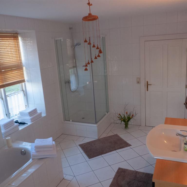 In die Ferienwohnung I gelangt man über einen großen Eingangsbereich mit Gäste-WC. Die 109 qm große Wohnung besitzt ein separates Elternschlafzimmer mit Doppelbett, ein Kinderzimmer mit zwei Einzelbetten und ein Wohnzimmer mit Blick über den entfernt liegenden Ort. Die Küche ist sehr groß und kann als Wohnküche bezeichnet werden. Die Küchenzeile verfügt neben Herd, Kühlschrank und Spülmaschine auch über eine Waschmaschine. Das Badezimmer ist sehr geräumig und mit einer Badewanne und Dusche ausgestattet.