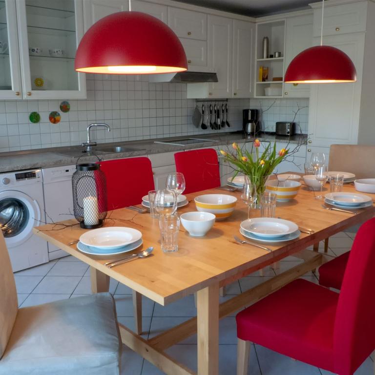 Die ca. 100 qm großen Ferienwohnungen liegen im Erdgeschoss des Hauses und sind für 4 bis max. 6 Personen (vier Erwachsene und zwei Kleinkinder) eingerichtet. Beide Wohnungen sind durch separate Eingänge zu erreichen und natürlich mit W- LAN und SAT-TV ausgestattet. Parkmöglichkeiten gibt es direkt vor dem Haus.