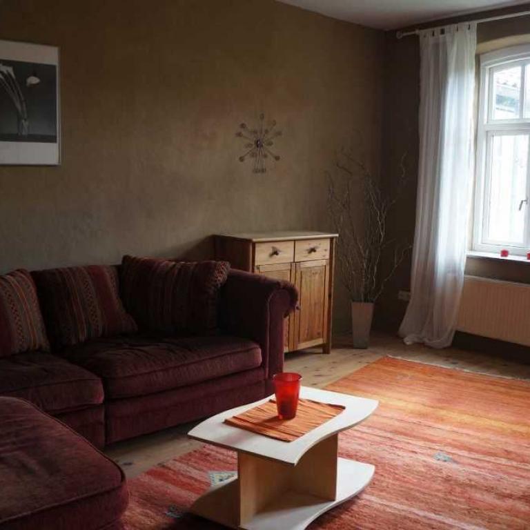 Durch einen separaten Eingang betreten unsere Gäste die 67 qm große Wohnung, die mit einem Wohnzimmer, Schlafzimmer und einem kleinen Kinderzimmer ausgestattet ist.