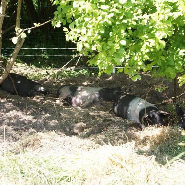 Wir betreiben eine kleine naturnahe Landwirtschaft mit Hühnern und glücklichen Freilandschweinen, die gerne zur Erheiterung unserer Gäste zur Verfügung stehen.