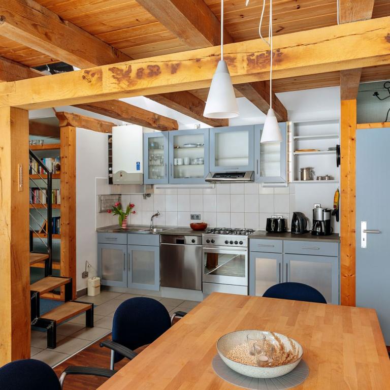 Das Ferienhaus gliedert sich in zwei Bereiche: Im Erdgeschoss finden Sie einen hellen und geräumigen Wohn- und Essbereich mit Flat-Screen-TV, Kaminofen (Kaminholz inklusive) und Couch sowie ein modernes Badezimmer mit Dusche. Im oberen Geschoss befinden sich die Schlafmöglichkeiten für bis zu vier Personen. Die großen Fenster sowie die offene Bauweise des Hauses bieten genug Platz und versprechen auch an trüben Tagen einen gemütlichen Urlaub. Eine große Terrasse mit Grill lädt zu entspannten (Grill-)Abenden ein. Das Ferienhaus bietet Platz für 4 Personen.