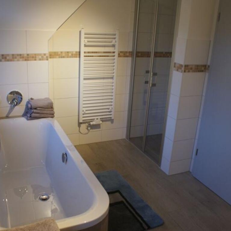 Im Obergeschoss befinden sich neben dem Vollbad mit Wanne & Dusche die beiden großen Schlafzimmer mit jeweils einem Doppelbett und einer Schlafcouch für 4 Personen je Zimmer.