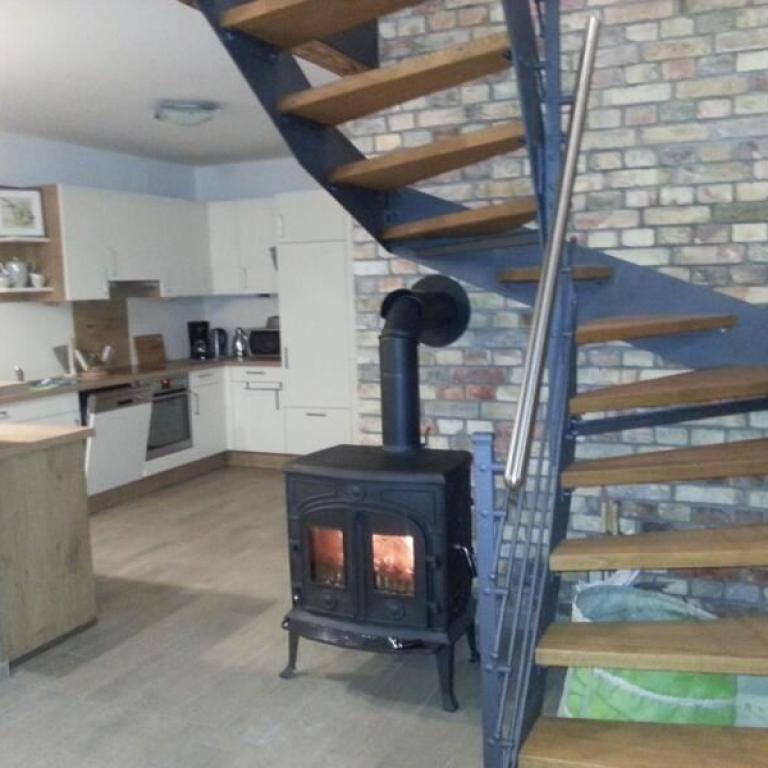 Im Erdgeschoss ist ein großer Wohn & Essbereich entstanden, mit gemütlicher, großer Relaxcouch, die sich auch zum Schlafen eignet, einem großen Esstisch für 10-12 Personen und einem wohligen Kamin. Wer auch im Urlaub nicht von der Welt abgeschnitten sein will, für den gibt es einen großen 55“ Fernseher für die ganze Familie.
