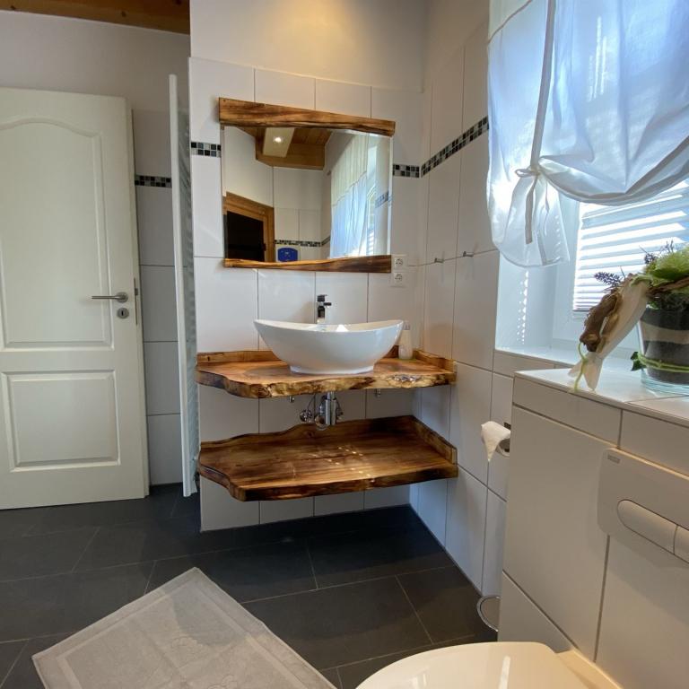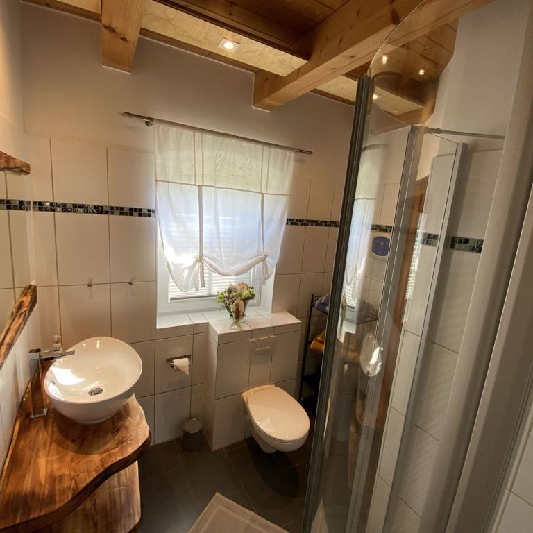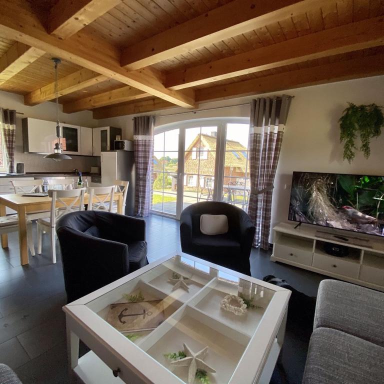 Eine voll ausgestattete Küche befindet sich in der unteren Etage, verbunden mit dem gemütlichen Wohn- und Esszimmer. Der Wohnbereich ist ausgestattet mit einer Polstersitzgruppe sowie mit einem 4K-Smart-TV (43“ inkl. Netflix, Disney +). Der Essbereich bietet ausreichend Platz für 6 Personen. Zur wohligen Gemütlichkeit trägt ein Kaminofen bei!