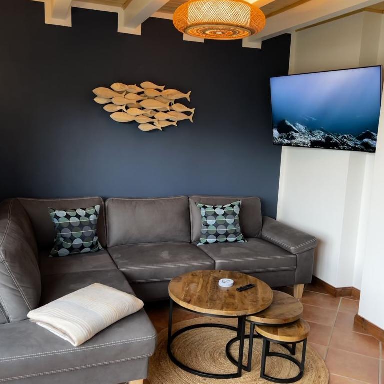 In der unteren Etage befindet sich, neben einem kleinen Bad, die vollausgestattete Küche, welche im Urlaub keine Wünsche offen lässt, sowie das gemütliche Wohn – und Esszimmer mit einem 4K – Smart – TV (55" inkl. Netflix, Apple TV und Disney +).