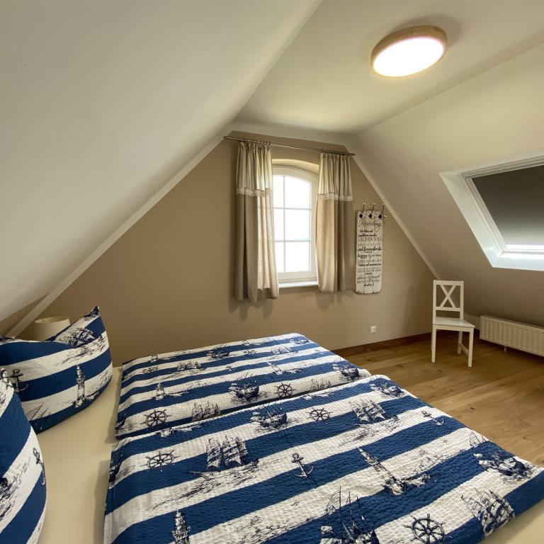 Bis zu fünf Personen können in der oberen Etage, aufgeteilt in zwei Zimmern, schlafen. Angrenzend ist ein kleines Duschbad.