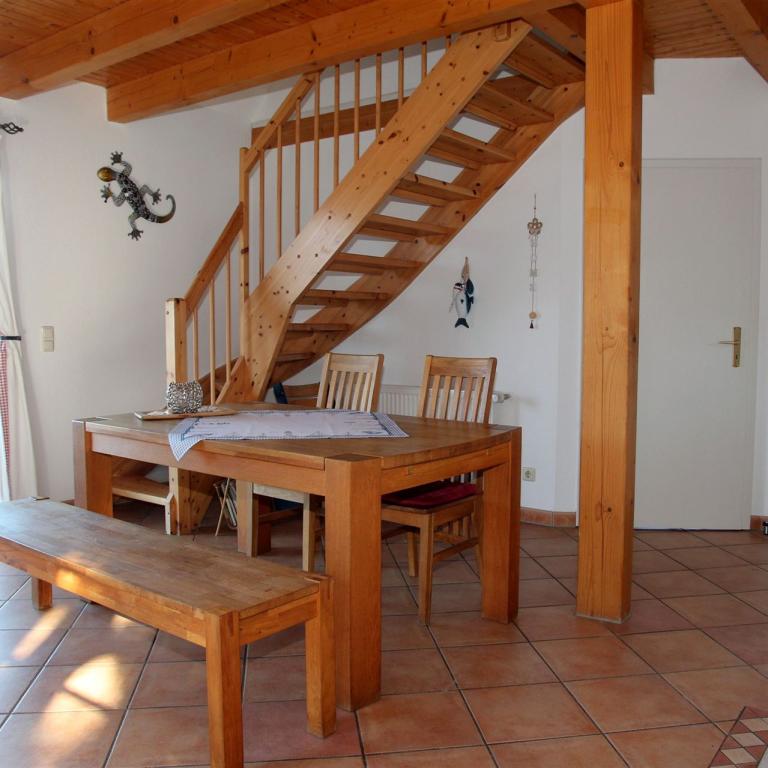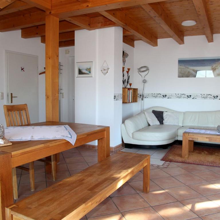 Im Erdgeschoss befinden sich ein großes Wohnzimmer mit Flachbildfernseher, Stereoanlage sowie ein Essbereich und eine bequeme Sitzecke.