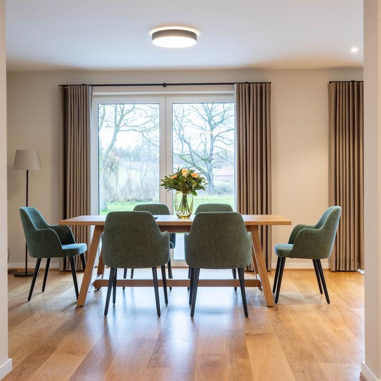 Die Ferienwohnungen auf Gut Zülow verbinden modernen Komfort mit ländlichem Charme. Sie bieten Platz für bis zu fünf Personen und verfügen über zwei Schlafzimmer, ein großzügiges, separates Wohnzimmer mit großem Fernseher sowie einen offenen Essbereich, der direkt an die voll ausgestattete Küche anschließt. Flexibel gestaltbare Schlafräume, Fußbodenheizung und allergikerfreundliche Bettwäsche sorgen für eine behagliche Atmosphäre. Auch ein Hund ist in der Wohnung erlaubt.