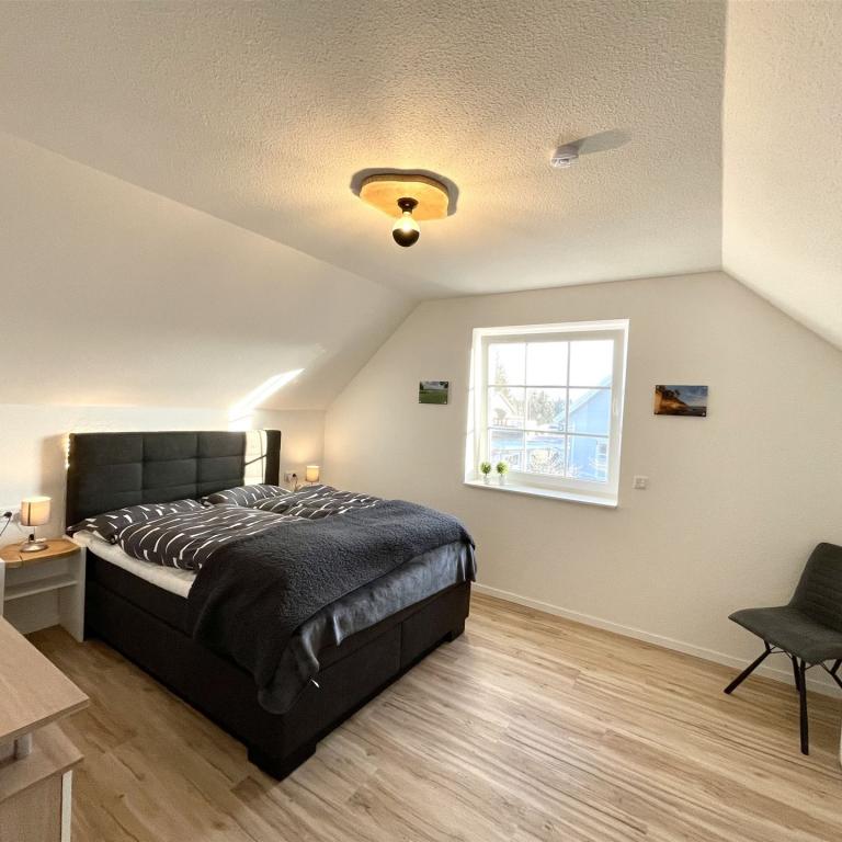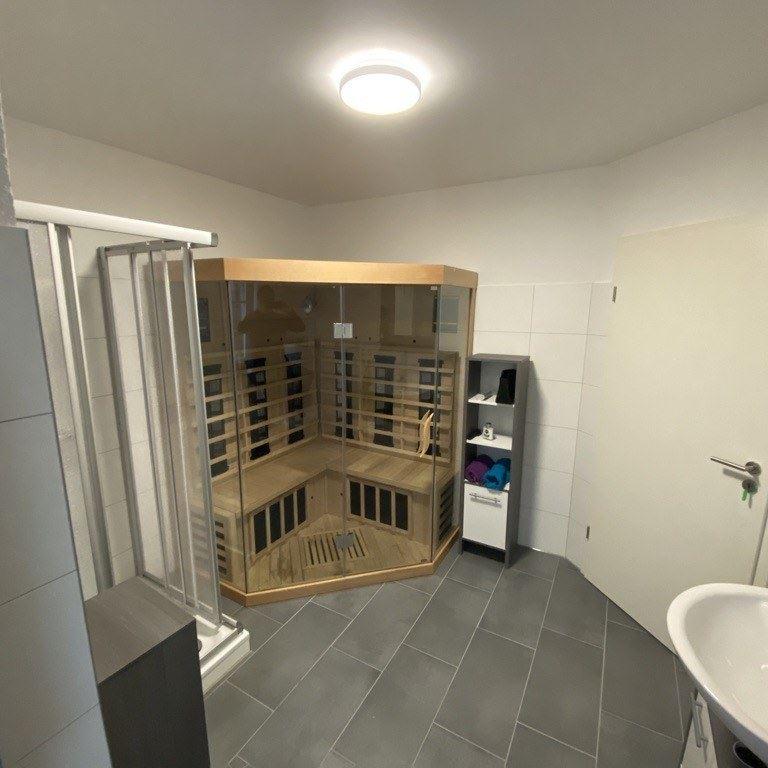 Das Schlafzimmer im Erdgeschoss ist mit einem hochwertigen Boxspringbett mit einem gepolsterten Kopfteil und einer Liegefläche von 1,80 x 2 m und einem Flachbildfernseher sowie einem Safe ausgestattet. Zusätzlich befindet sich im Erdgeschoss ein schönes Duschbad mit einer geräumigen Dusche mit flachem Einstieg. Hinzu kommen Handtuchheizkörper und ein Fön. Das hochwertige Duschbad ist zusätzlich mit einer Infrarotkabine mit 140x140 cm für 2-4 Personen ausgestattet.