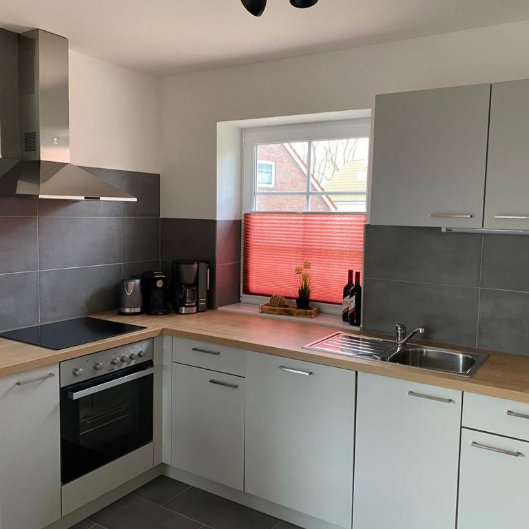 In unserem Ferienhaus sind auch eine Waschmaschine, Wäscheständer, Bügeleisen und Bügelbrett vorhanden. Die moderne Küche bietet eine vielfältige Ausstattung mit einem Backofen, einer Mikrowelle, einem Kühlschrank mit Gefrierfach, einer Geschirrspülmaschine, einer Kaffeemaschine, einer Caffisimo, einem Toaster, einem Wasserkocher, Sandwichmaker, Stabmixer, Waffelautomat, Nicer Dicer, Töpfen und weiterem vielfältigem Kochgeschirr.