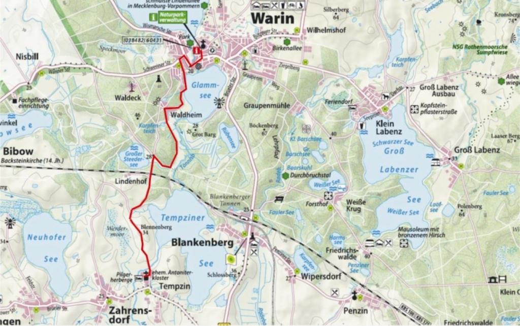 An der Kreuzung biegen wir rechts ab und erreichen den Steeder See. Dort können wir in den Sommermonaten ein erfrischendes Bad nehmen. Der Landweg setzt sich in südliche Richtung fort, quert Bahngleise und führt in eine Offenlandschaft mit Weide- und Ackerflächen. Der Tempziner See blinkt aus der Ferne mit seiner Wasseroberfläche. Bald erblicken wir die Kirchturmspitze der Klosterkirche von Tempzin. Bevor wir in den Ort gelangen, passieren wir die Brücke am Mühlenbach. An dieser Stelle befindet sich ein historischer Wegweiserstein. Empfohlen wird zum Abschluss der Wanderung eine Führung durch das ehemalige Antoniter-Kloster.