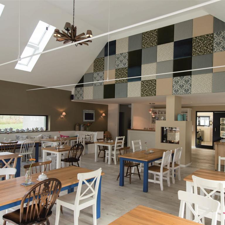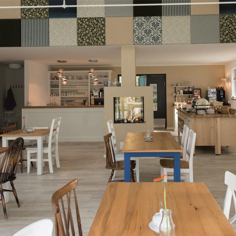 Auch herzhafte Snacks finden Sie auf der Karte. Auf der großen Sonnenterrasse mit Blick auf die Warnow können Sie auch Eis genießen. Auf der Wiese gibt es Spielmöglichkeiten, wie Tischtennis oder Leitergolf, direkt daneben steht unser Kinderspielhaus "GUTskinder". Drinnen sorgt ein Kamin für kuschelige Atmosphäre. Morgens serviert hier das Team von GUT VORBECK den Gästen das leckere Landhausfrühstück. Das Gutscafé "HerzensGUT" können Sie auch für Feierlichkeiten mieten. Bis zu 35 Gästen bietet das Haus Platz.