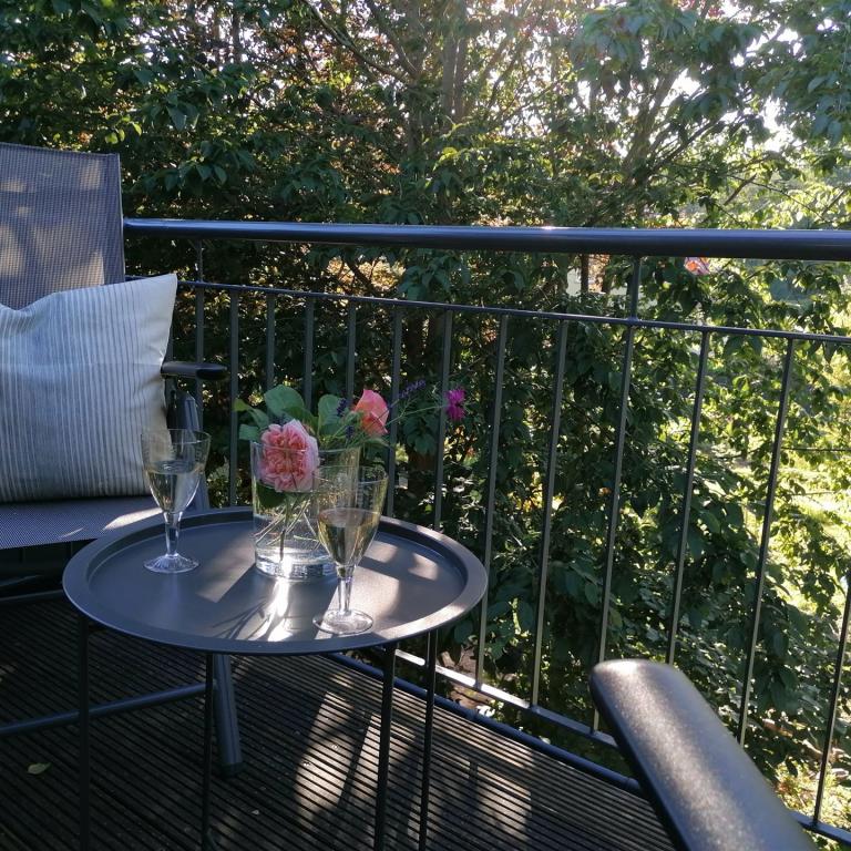 Die Küche ist mit Herd/Backofen, Kühlgefrierkombination, Mikrowelle, Kaffeemaschine ausgestattet. Von hier aus können sie den Balkon mit Blick in den Garten betreten. Ein großzügiger Wohnraum lädt auch an Regentagen zum Verweilen ein.