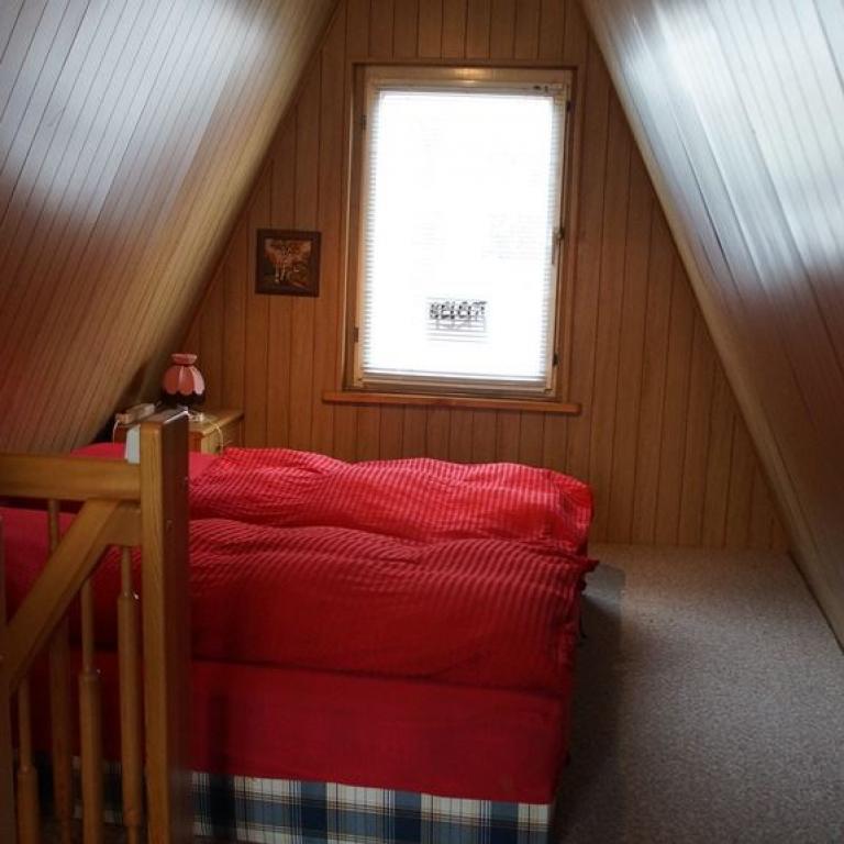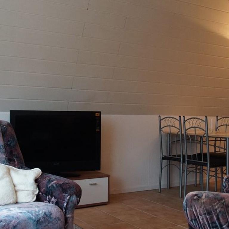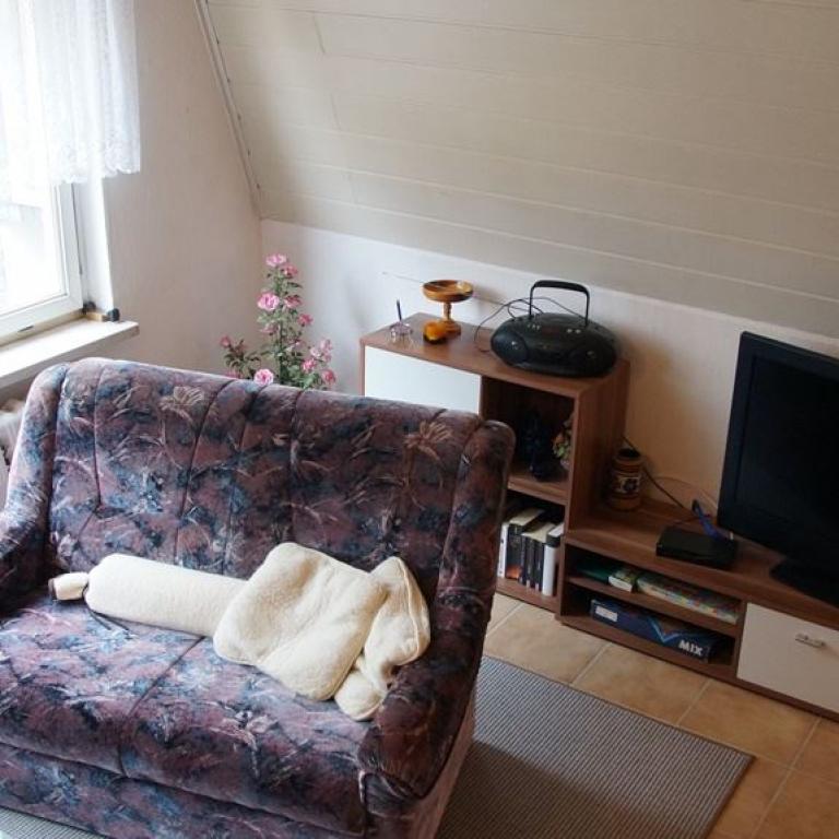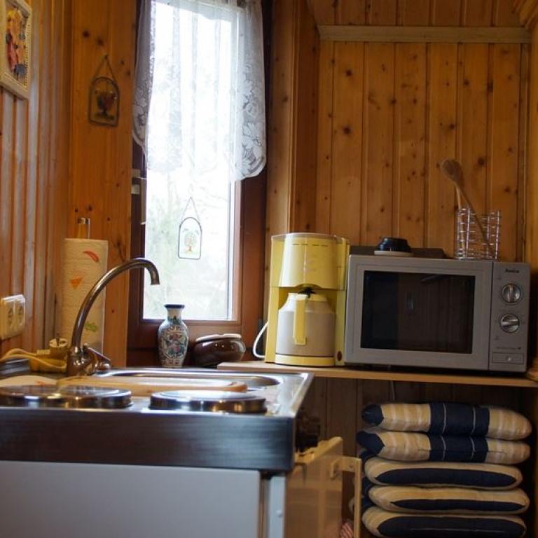 lm Erdgeschoss der Finnhütte finden Sie einen gemütlichen Wohn- Essbereich mit Flachbild-Sat-TV, eine kleine Küche und ein Duschbad. Ein Sofa wird bei Bedarf zum Doppelbett. lm Obergeschoss ist der Schlafraum für drei Personen. Von der möblierten Terrasse aus schauen Sie auf unseren kleinen Weiher und in den Obstgarten. Ihren Hund können Sie gern mitbringen.