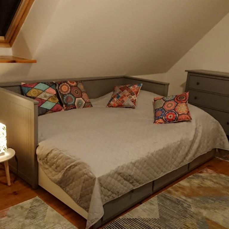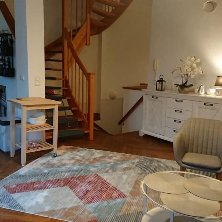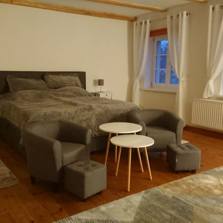 Im Gutshaus befindet sich eine 140m² große Ferienwohnung auf drei Etagen. Die Wohnung verfügt über eine offene Wohnraumgestaltung, hohe Decken und Echtholzböden.
