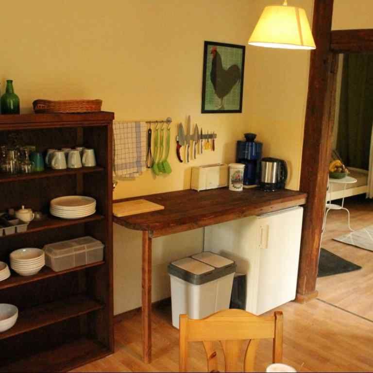 offene Küche mit Kochfeld, Kühlschrank, Kaffeemaschine, Wasserkocher und Toaster
