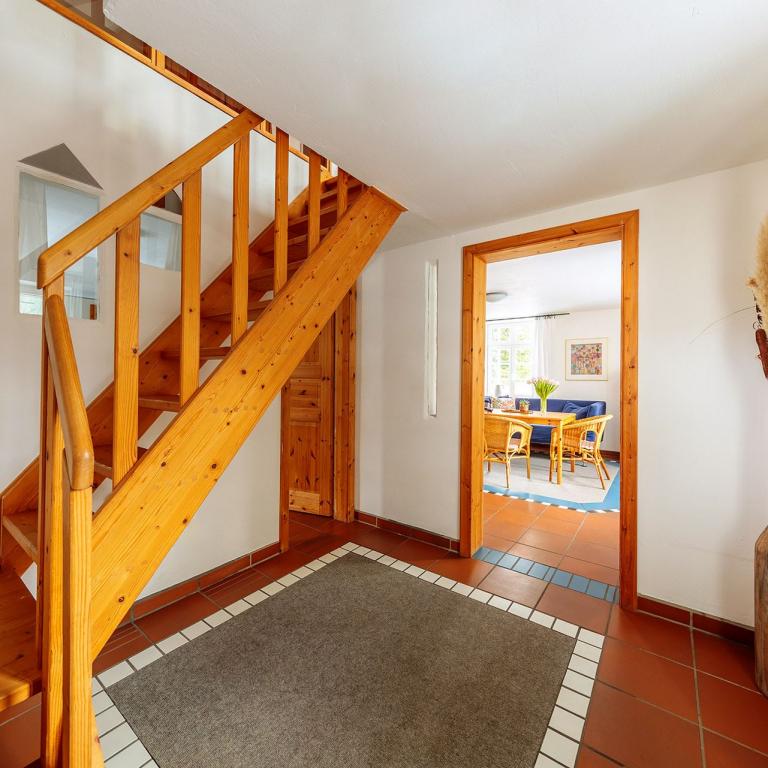 Das Ferienhaus gliedert sich in zwei Bereiche: Im Erdgeschoss finden Sie einen hellen und geräumigen Wohn- und Essbereich mit Flat-Screen-TV, Kaminofen (Kaminholz inklusive) und Couch sowie ein modernes Badezimmer mit Dusche. Im oberen Geschoss befinden sich die Schlafmöglichkeiten für bis zu vier Personen. Die großen Fenster sowie die offene Bauweise des Hauses bieten genug Platz und versprechen auch an trüben Tagen einen gemütlichen Urlaub. Eine große Terrasse mit Grill lädt zu entspannten (Grill-)Abenden ein. Das Ferienhaus bietet Platz für 4 Personen.