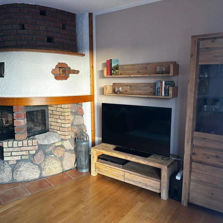 Ein großer Kamin spendet an kühlen Tagen oder Abenden wohlige Wärme. Ein Stellplatz für PKW`s ist ebenso vorhanden, wie ein abschließbarer Fahrradschuppen.
