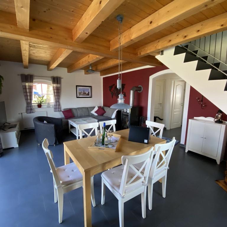 Eine voll ausgestattete Küche befindet sich in der unteren Etage, verbunden mit dem gemütlichen Wohn- und Esszimmer. Der Wohnbereich ist ausgestattet mit einer Polstersitzgruppe sowie mit einem 4K-Smart-TV (43“ inkl. Netflix, Disney +). Der Essbereich bietet ausreichend Platz für 6 Personen. Zur wohligen Gemütlichkeit trägt ein Kaminofen bei!