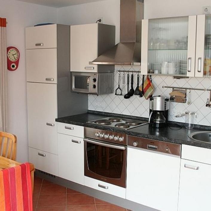 Die Küche verfügt über eine Spülmaschine, einen Elektroherd mit 4 Platten und Multifunktionsbetrieb (Umluft usw.), eine Mikrowelle und einen Kühlschrank mit großem separaten Tiefkühlfach. Es sind 2 Sonnenliegen, Tisch mit 6 Stühlen, ein Grill und ein Sonnenschirm vorhanden.