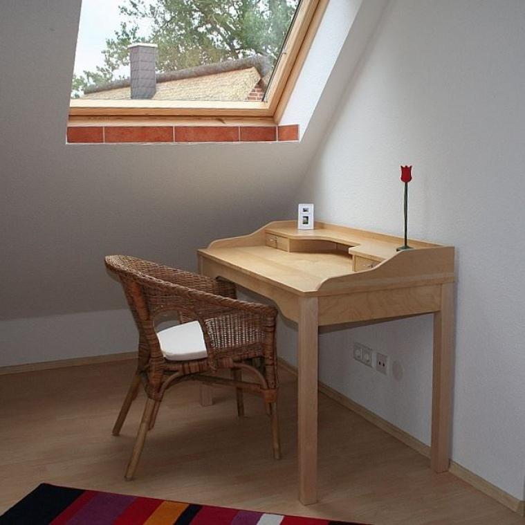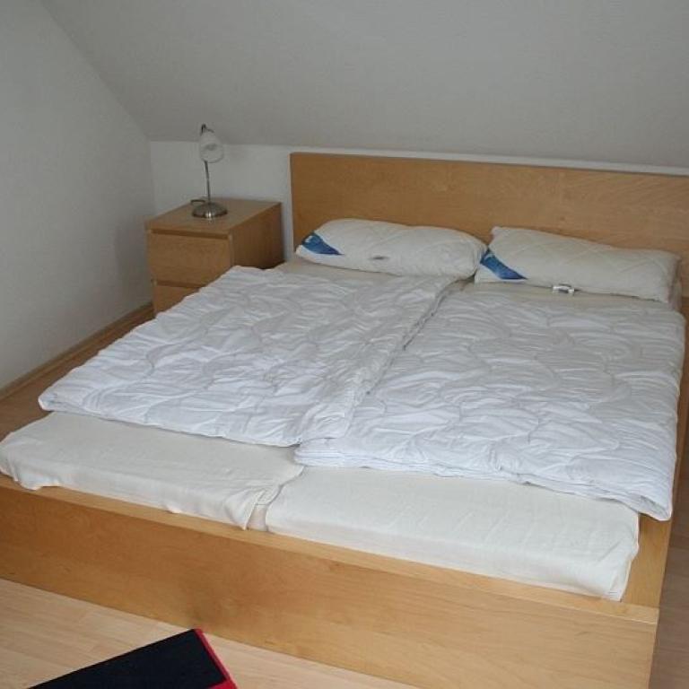 Die drei Schlafzimmer verfügen über je 2 Schlafplätze. Oben im Schlafzimmer zur Terrasse befindet sich ein Doppelbett (Breite 1,60 x 2,00 m). Oben im "Kinderzimmer" sind zwei Einzelbetten mit 0.90 x 2,00m. Das Schlafzimmer im Erdgeschoss hat zwei einzelne Betten mit 0.90 x 2,00 m, die jedoch leicht zusammengeschoben werden können (da sie keinen Außenrahmen haben) und so eine Liegefläche ergeben. In jedem Schlafzimmer befindet sich ein geräumiger Kleiderschrank.