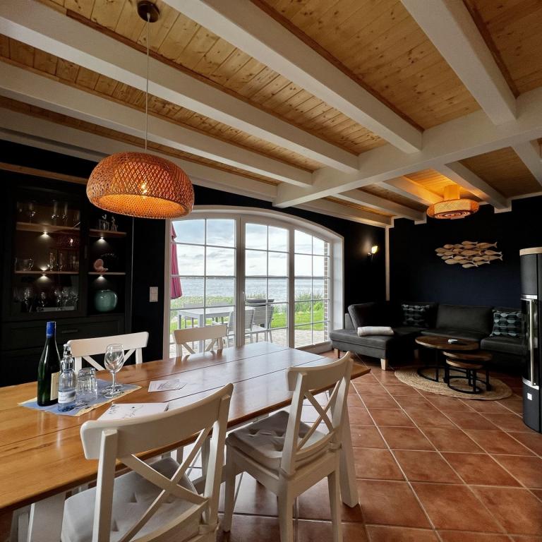 Der Wohnbereich ist ausgestattet mit einer Polstersitzgruppe und der Essbereich bietet Platz für bis zu 5 Personen. Weiterhin ist ein Kaminofen vorhanden, dieser trägt bei Bedarf zu einer wohligen Wärme und Gemütlichkeit bei. Durch das großzügige Terrassenfenster erhalten Sie einen traumhaften und einzigartigen Blick auf den Sternberger See!- Ebenso von der eingerichteten Terrasse mit Grill.