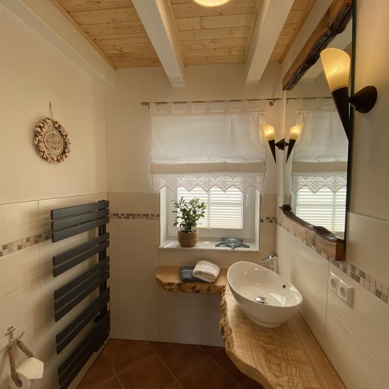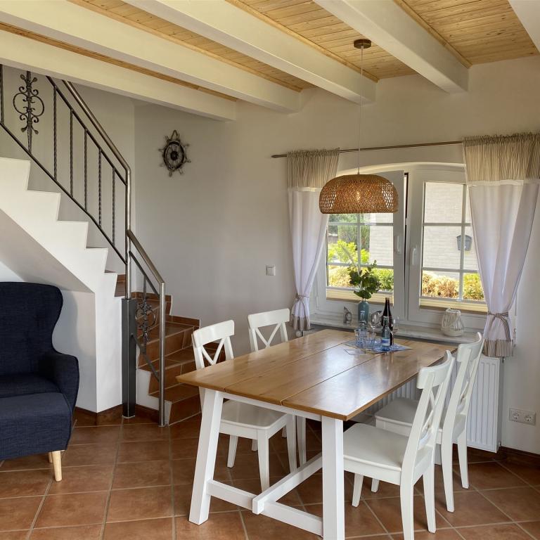 In der unteren Etage befindet sich, neben einem kleinen Bad, die vollausgestattete Küche, welche im Urlaub keine Wünsche offen lässt, sowie das gemütliche Wohn – und Esszimmer mit einem 4K – Smart – TV (55" inkl. Netflix, Apple TV und Disney +).