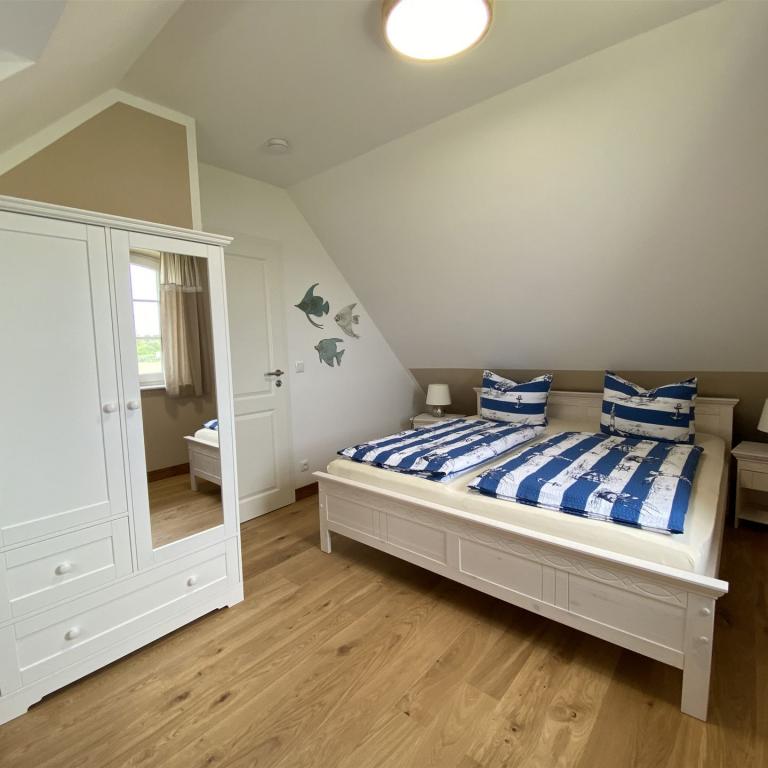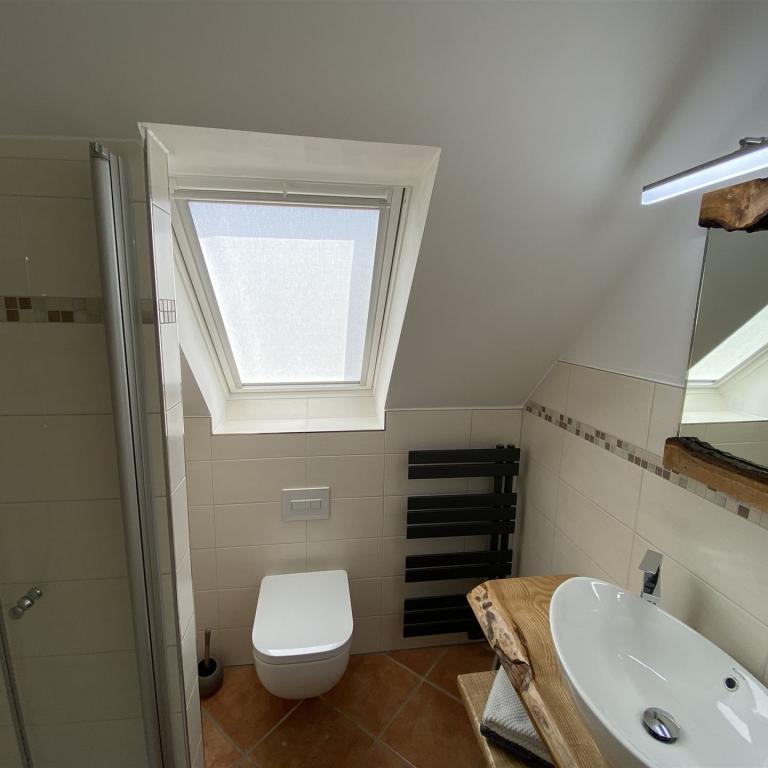 Bis zu fünf Personen können in der oberen Etage, aufgeteilt in zwei Zimmern, schlafen. Angrenzend ist ein kleines Duschbad.