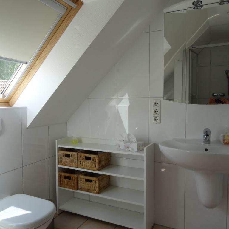 Ein großzügiges Bad mit Dusche und Waschmaschine befindet sich ebenfalls im Obergeschoss.